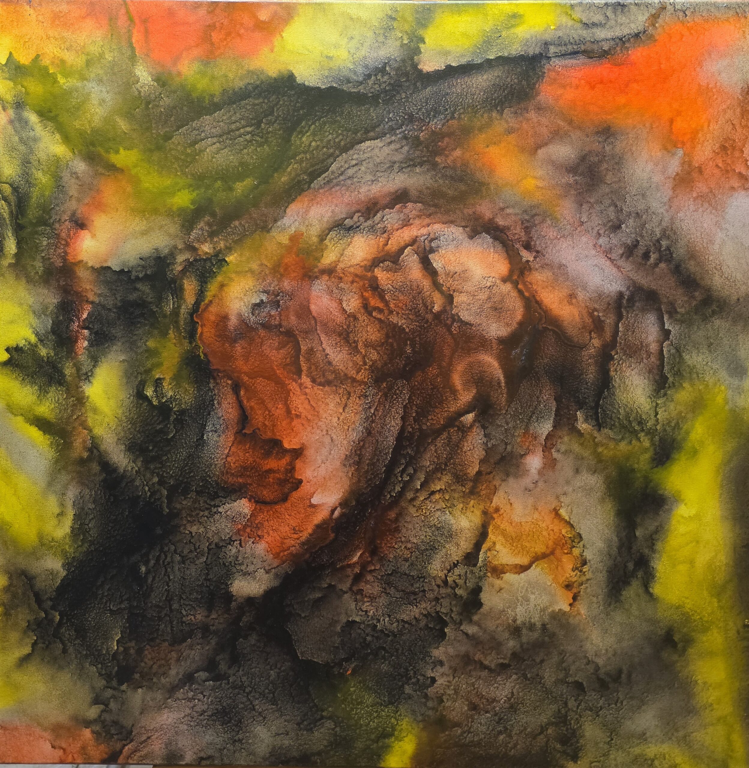 To je prostor, kjer besede niso več lahke. Vsaka misel, ki je bila nekoč izrečena brez odgovornosti, tukaj dobi težo kamna. Barve so goste, zgoščene, kot da bi se resnica sama trudila priti na površje, a jo znova in znova potegne nazaj lastna senca. Oranžna in rdeča še gorita, a ne grejeta več, sta žerjavica izrečenega, kar ni bilo mišljeno s srcem. Rumeni bliski so spomini na luč, ki je bila nekoč dosegljiva, pa je bila zavrnjena.