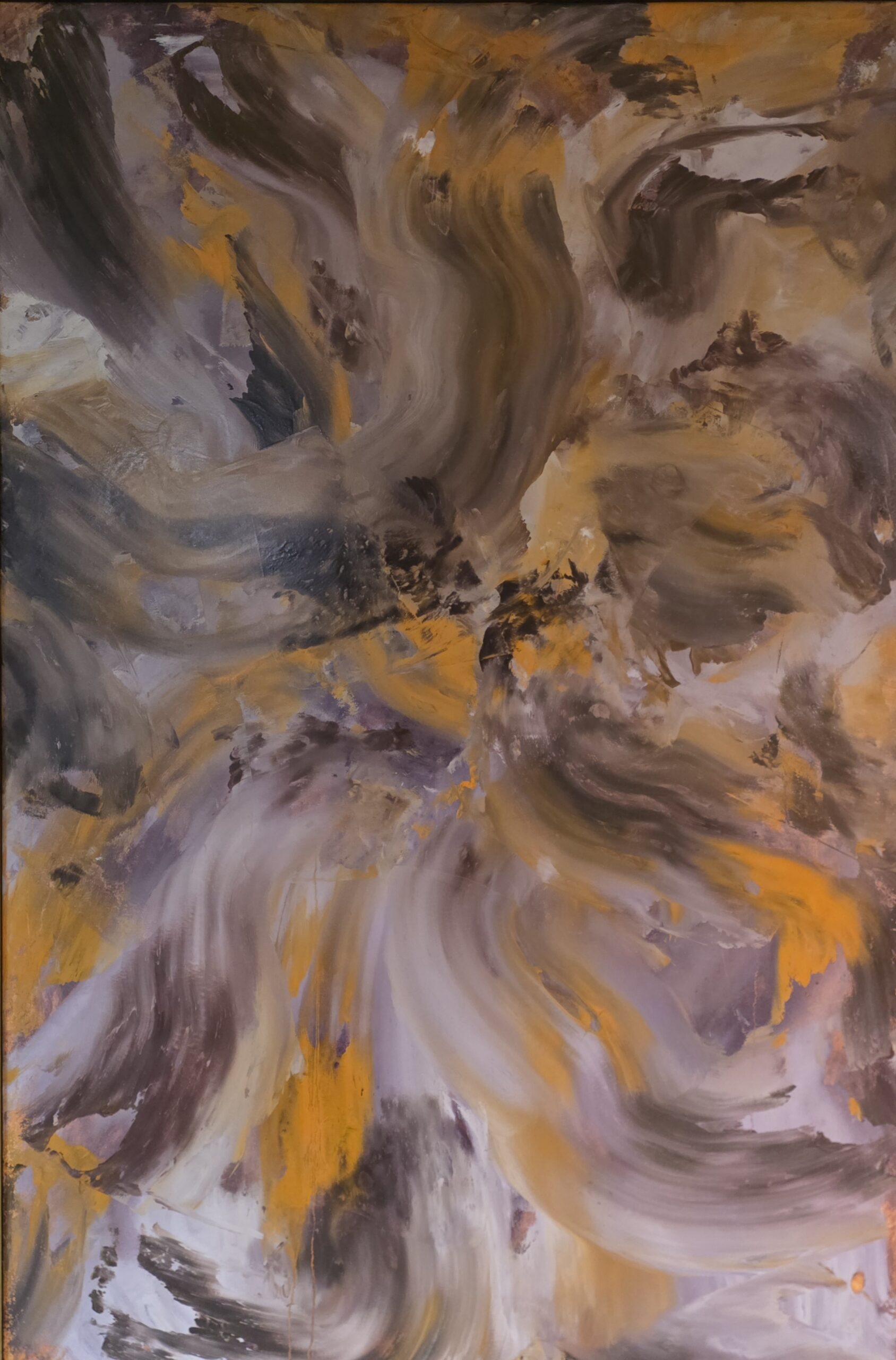 V tej sliki ni miru, a tudi nemira ne. Je gibanje, ki ne beži in ne lovi, samo je. Poteze se vrtinčijo kot spomini, ki nimajo več ostrih robov, le še toplino barve in težo občutka. Rjavi in zlatorumeni toni so kot zemlja, ki se premešča sama s seboj, vijolični šepetajo o nečem notranjem, neizrečenem. V središču se vse steka in hkrati razpira. Kot dih, ko vdihneš, se svet zbere, ko izdihneš, se razlije. Ni začetka in ni konca, le tok, ki nosi sledove vsega, kar je bilo, in prostora za tisto, kar šele prihaja. To je slika trenutka, ko se človek ne upira več gibanju življenja. Ko dovoli, da ga vrtinec ne razbije, ampak preoblikuje. In prav tam, v tem navideznem kaosu, se rodi tišina, globoka, topla in resnična.